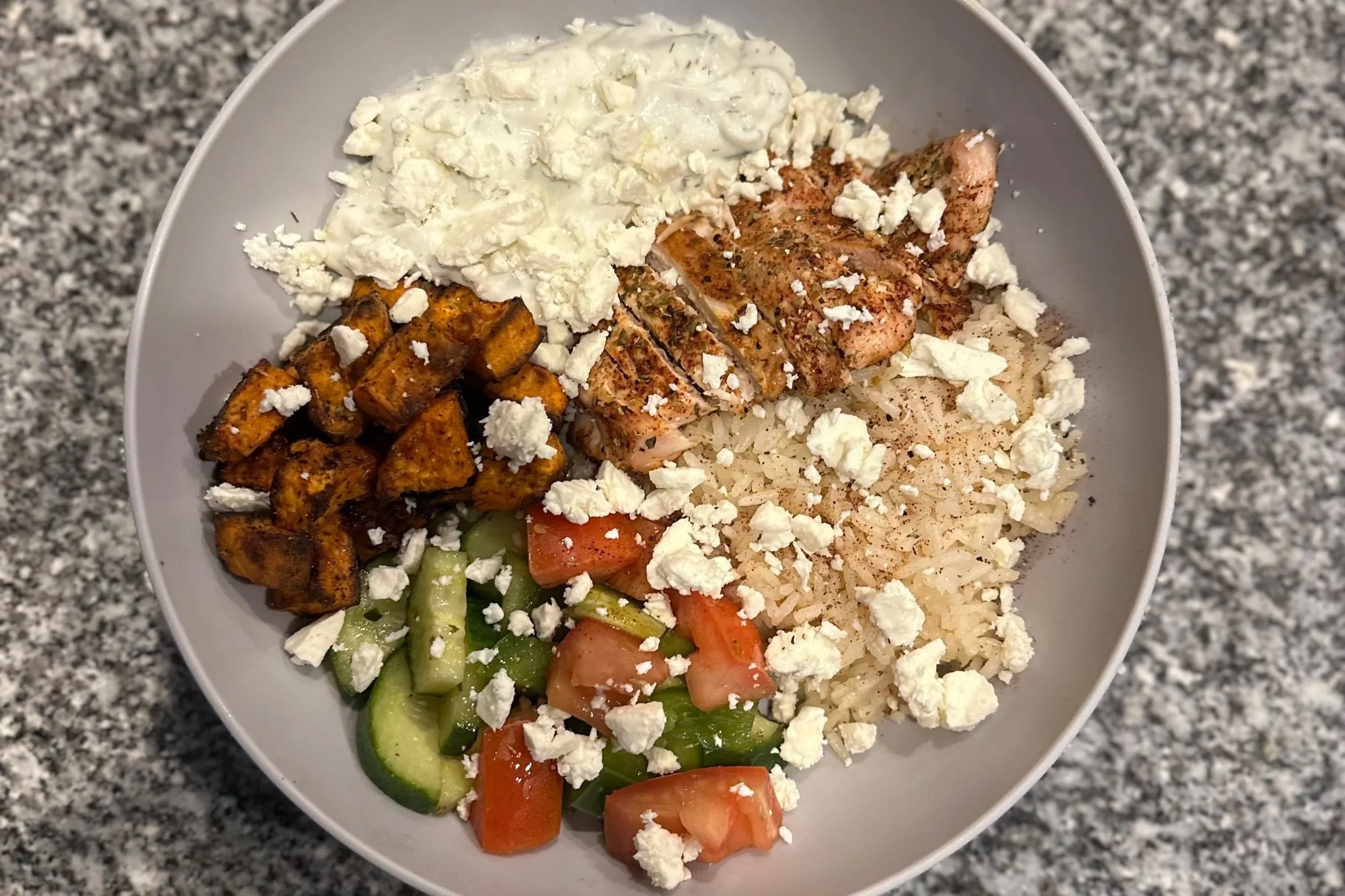 This is a more basic take on a Mediterranean bowl - minimizing ingredients to keep it simple for grocery shopping, while still giving you a nice balance of nutrients to carry you through the afternoon. This meal is very meal-preppable - just heat back up the things you want hot (the chicken, rice, and sweet potatoes), and add the other cold things (the tzatziki, veggies, and feta) to finish it off! The two components that need roasting (sweet potato and chicken) are cooked at the same temperature, so if you play your timing right, you can make this super efficient to make the most of your meal prep time.
