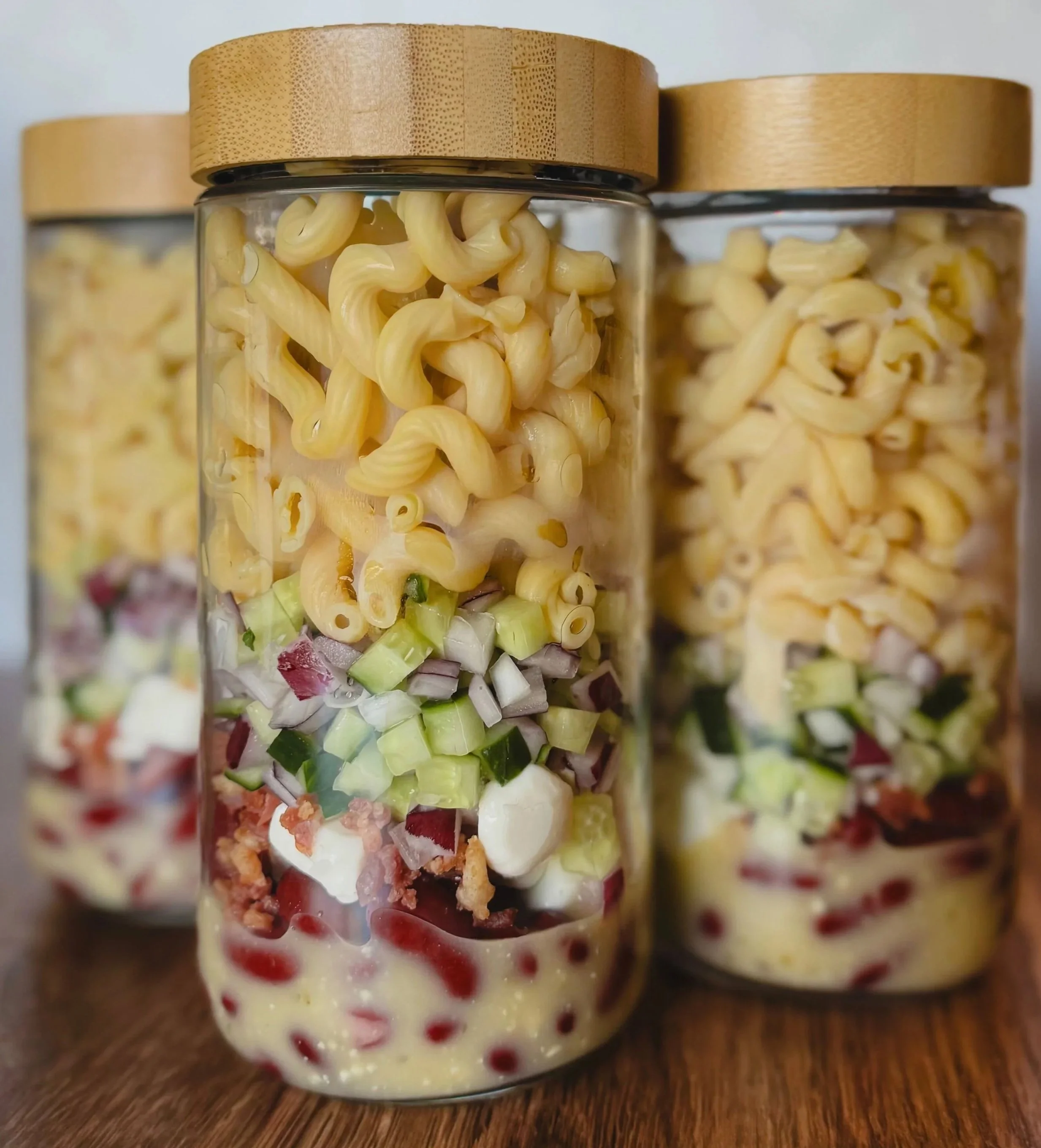 I layer mine in this order: dressing, kidney beans, mozzarella pearls, bacon bits, cucumber, red onions, then pasta.
