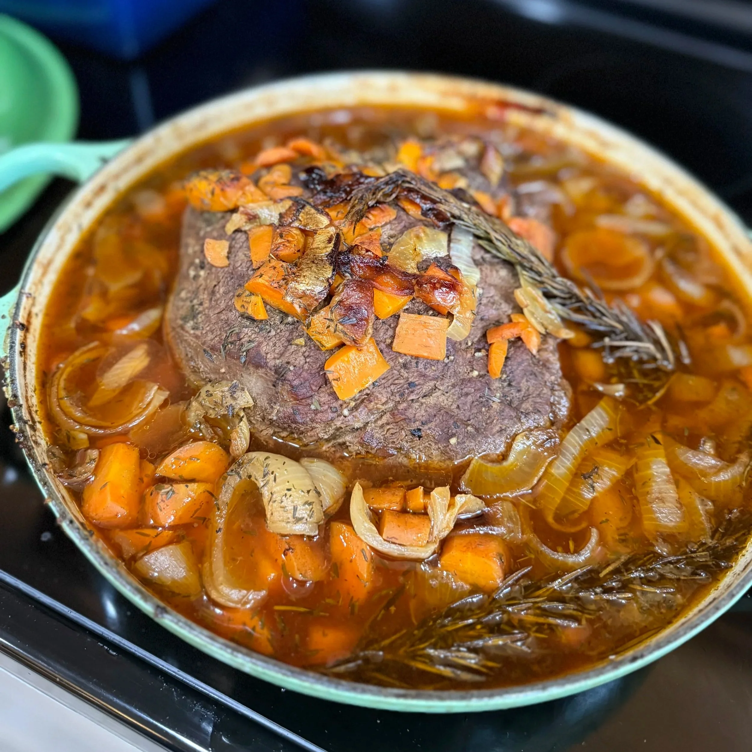 Return the roast to the pot. Add enough broth to come about halfway up the roast. Add the onions and carrots back in and top with rosemary and thyme.