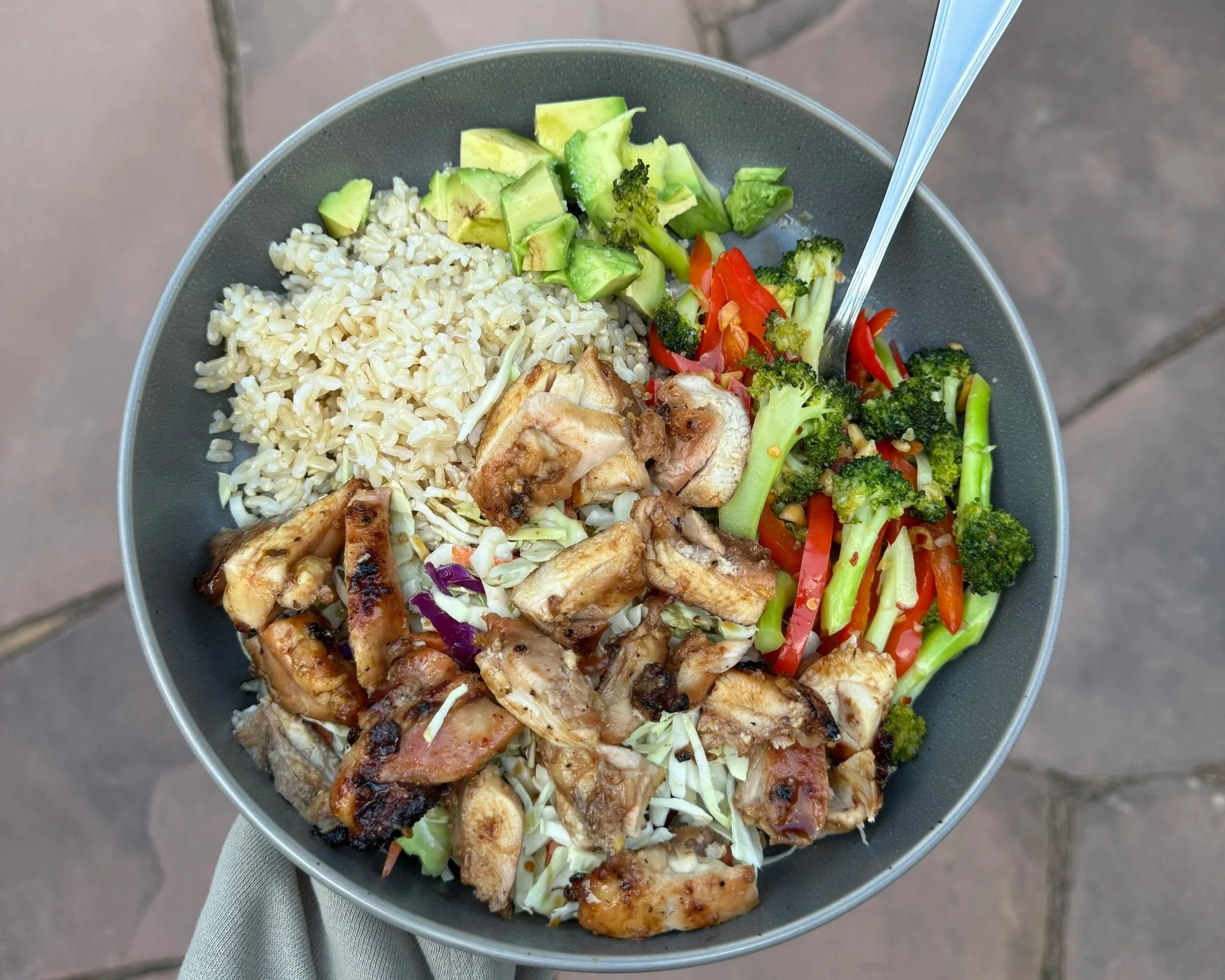 To assemble, add the desired amount of rice to the bowl. Top with chicken thighs, shredded cabbage, avocado, broccoli, red bell peppers, and more Japanese BBQ sauce, if desired.